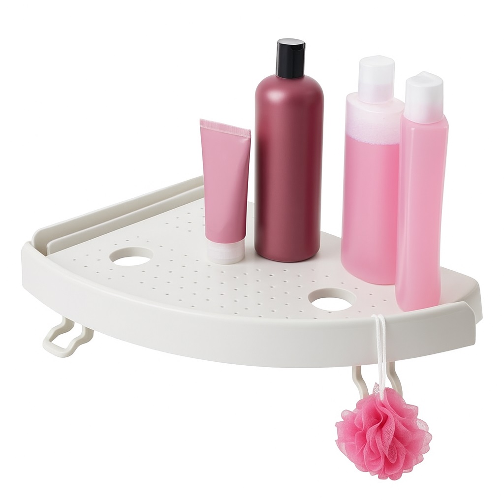 Χάρη στο ειδικό του design, τα μπουκαλάκια και τα αντικείμενα μένουν σταθερά στη θέση τους χωρίς να γλιστρούν. Διαθέτει επιπλέον γάντζους για να κρεμάτε πετσέτες, σφουγγάρια ή μικροαντικείμενα.