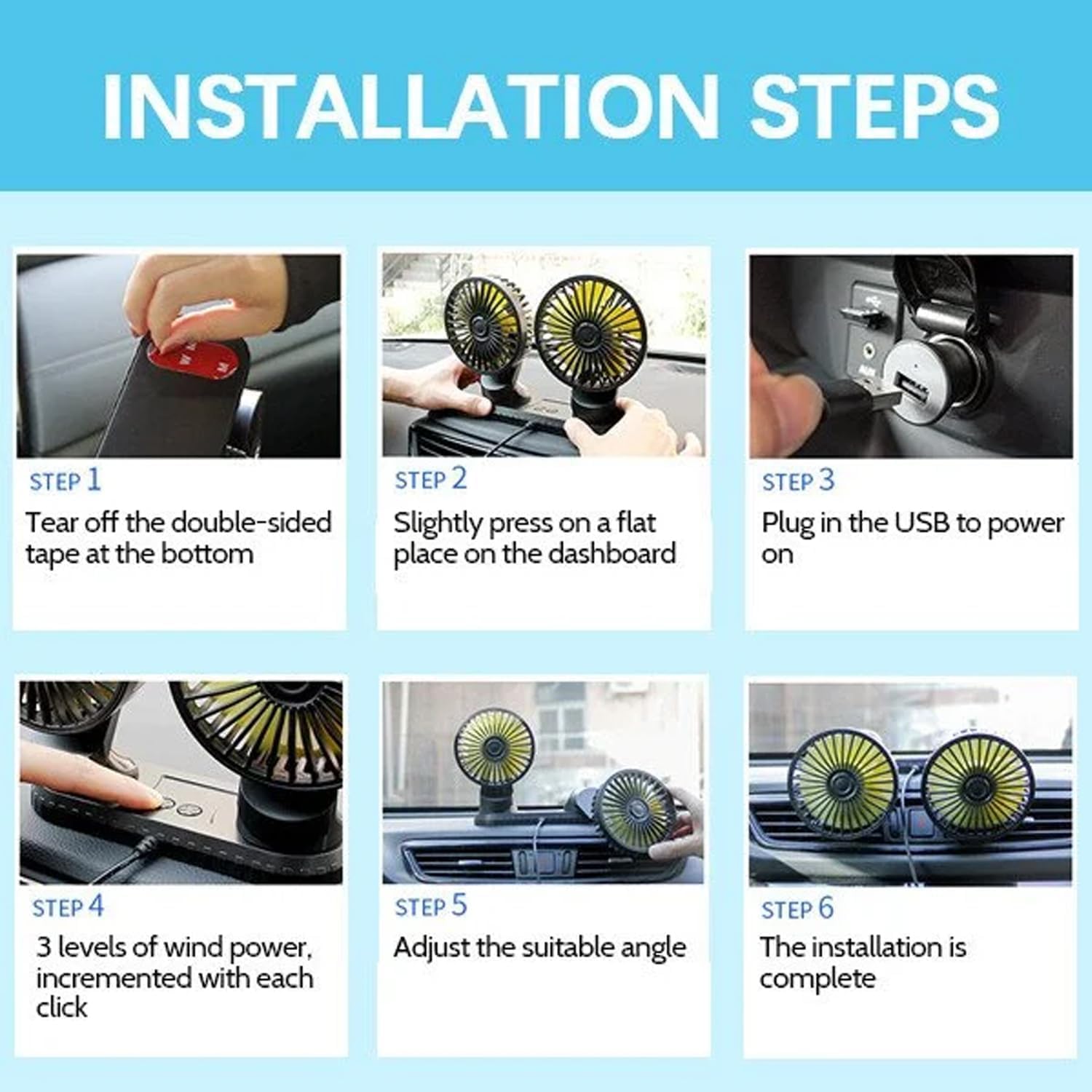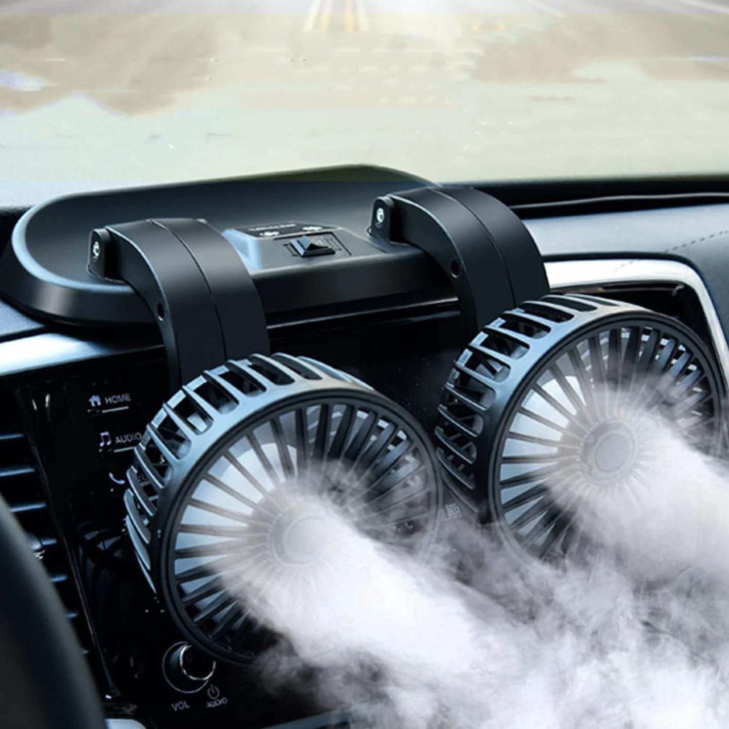 Διπλός Ανεμιστήρας Καμπίνας Αυτοκινήτου 12V με δύο ταχύτητες και πλήρως περιστρεφόμενες κεφαλές 360° , καθώς και ρυθμιζόμενο ύψος για πολλαπλές επιλογές κατεύθυνσης αέρα. Εύκολη τοποθέτηση στο ταμπλό με ισχυρό αυτοκόλλητο διπλής όψης στη βάση. Διαθέτει πλήκτρο On/Off. Λειτουργία με ενσωματωμένη πρίζα αναπτήρα αυτοκινήτου.