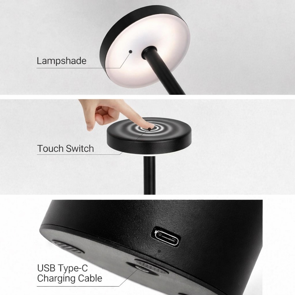 Διαθέτει 3 θερμοκρασίες φωτός (3000K / 4500K / 5000K), επιτρέποντας εύκολη προσαρμογή της ατμόσφαιρας από ζεστό και χαλαρωτικό έως ουδέτερο ή πιο φωτεινό. Ο διακόπτης αφής προσφέρει άνετο χειρισμό, ενώ η επαναφορτιζόμενη λειτουργία μέσω USB εξασφαλίζει ευελιξία χωρίς συνεχή σύνδεση στο ρεύμα.