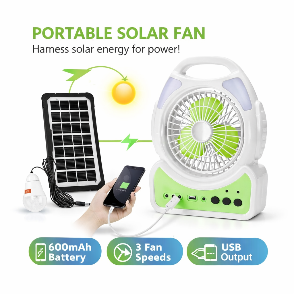 Ο φορητός ηλιακός ανεμιστήρας 6’’ αποτελεί μια πρακτική λύση για δροσιά και φωτισμό χωρίς ρεύμα. Εκμεταλλεύεται την ηλιακή ενέργεια για να φορτίζει την ενσωματωμένη μπαταρία, προσφέροντας αυτονομία σε εξωτερικούς χώρους, camping ή διακοπές ρεύματος.