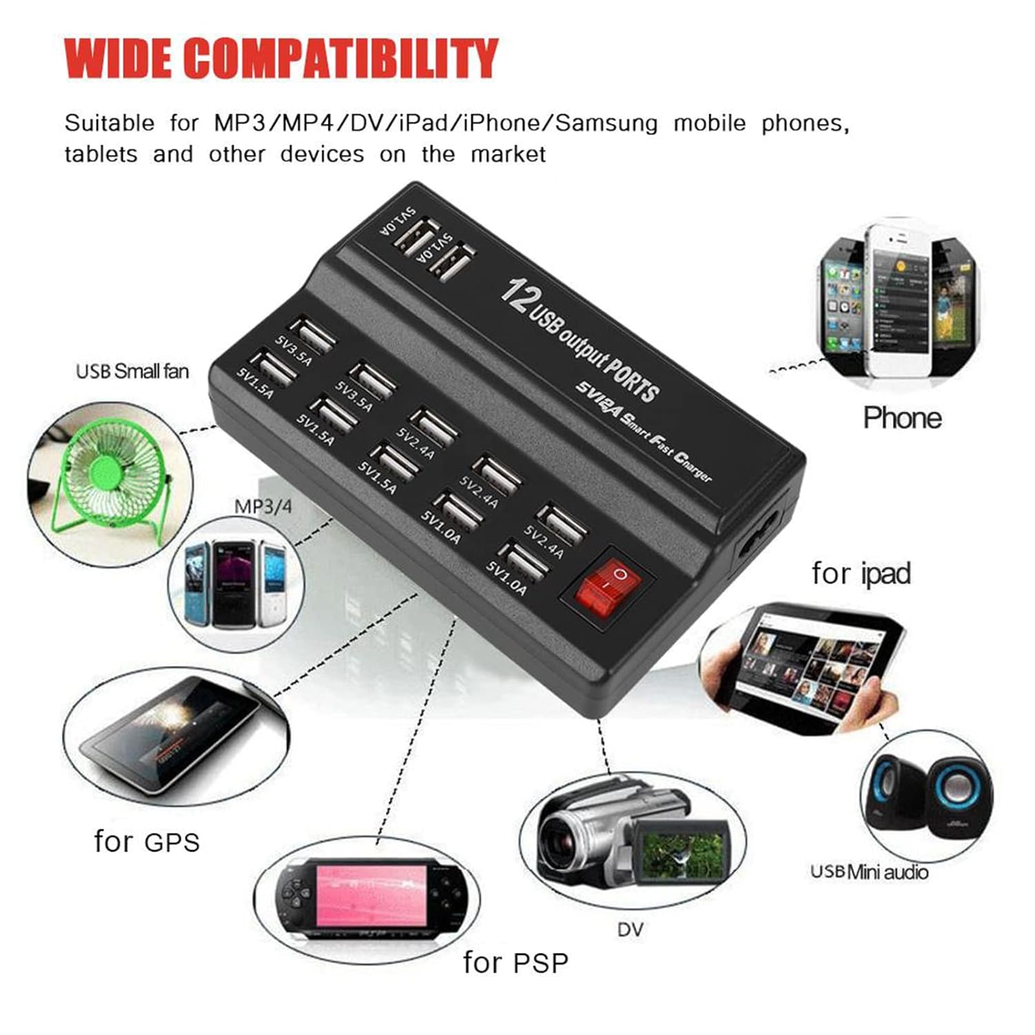 Φορτιστής πρίζας με 12 θύρες USB για τις συσκευές σας. Διαθέτει διακόπτη ασφαλείας On/Off καθώς και προστασία υπερθέρμανσης και υπερφόρτισης. Κατάλληλος για φόρτιση κινητού, κάμερας και άλλων συσκευών που φορτίζουν μέσω USB.
