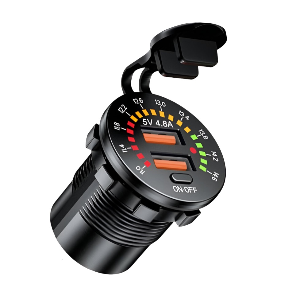 Πρακτικός διπλός φορτιστής αυτοκινήτου USB με ενσωματωμένο βολτόμετρο για έλεγχο της τάσης της μπαταρίας. Προσφέρει ταχεία και ασφαλή φόρτιση δύο συσκευών ταυτόχρονα.