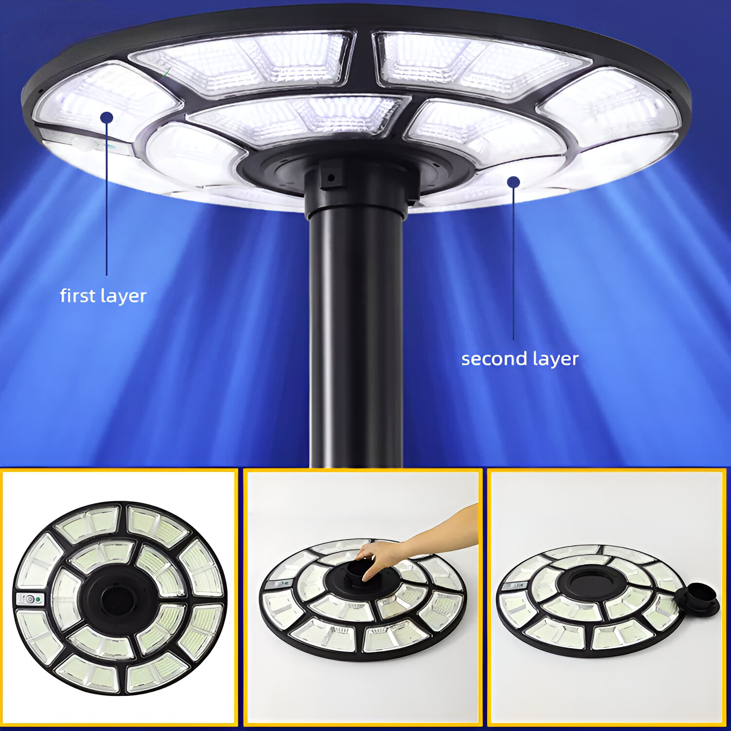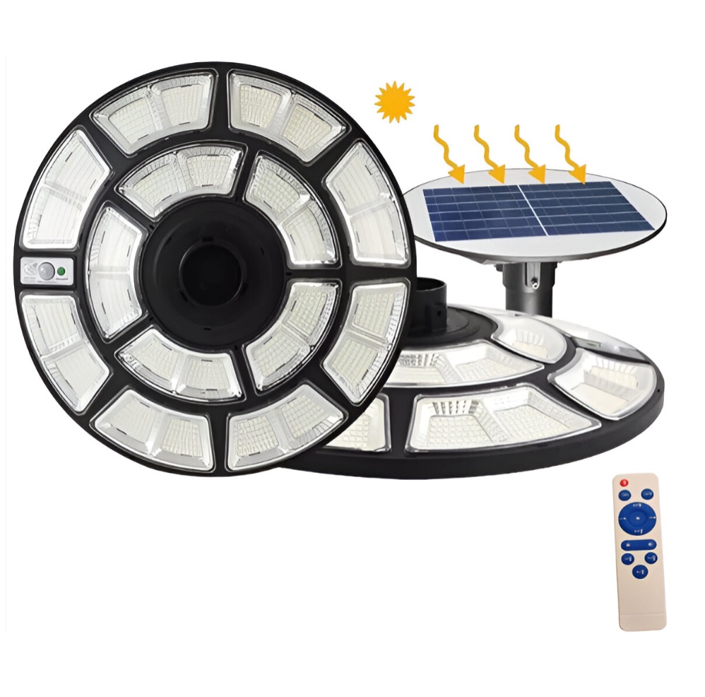 Το ηλιακό φωτιστικό δρόμου 1200W προσφέρει ισχυρό και έντονο φωτισμό, ιδανικό για μεγάλες εξωτερικές περιοχές όπως κήποι, πάρκινγκ, δρόμοι ή πλατείες. Ο μοντέρνος σχεδιασμός UFO προσδίδει φουτουριστική αισθητική στον εξωτερικό σας χώρο, ενώ η ενσωματωμένη ηλιακή ενέργεια το καθιστά φιλικό προς το περιβάλλον και ενεργειακά αποδοτικό, αξιοποιώντας την ηλιακή ακτινοβολία κατά τη διάρκεια της ημέρας για να τροφοδοτήσει το φως τη νύχτα.