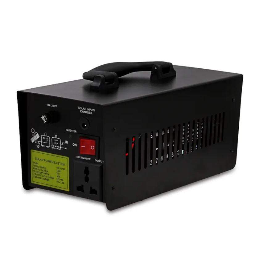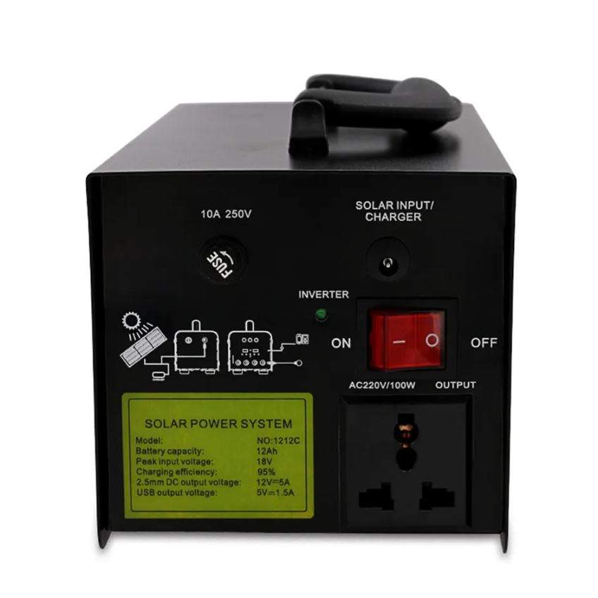 Ηλιακό Σύστημα Inverter Φωτισμού Και Ενέργειας που διαθέτει φωτοβολταϊκό πάνελ. Επίσης διάθέτει εσωτερική ισχυρή επαναφορτιζόμενη μπαταρία (12v 12Ah), τρεις λάμπες led με τις προεκτάσεις. Περιλαμβλανει πλεξούδα usb με αντάπτορες για την φόρτιση κινητών τηλεφώνων και διάφορων άλλων συσκευών (φωτογραφικών μηχανών, ipod, mp3-mp4 player, psp κτλ) .