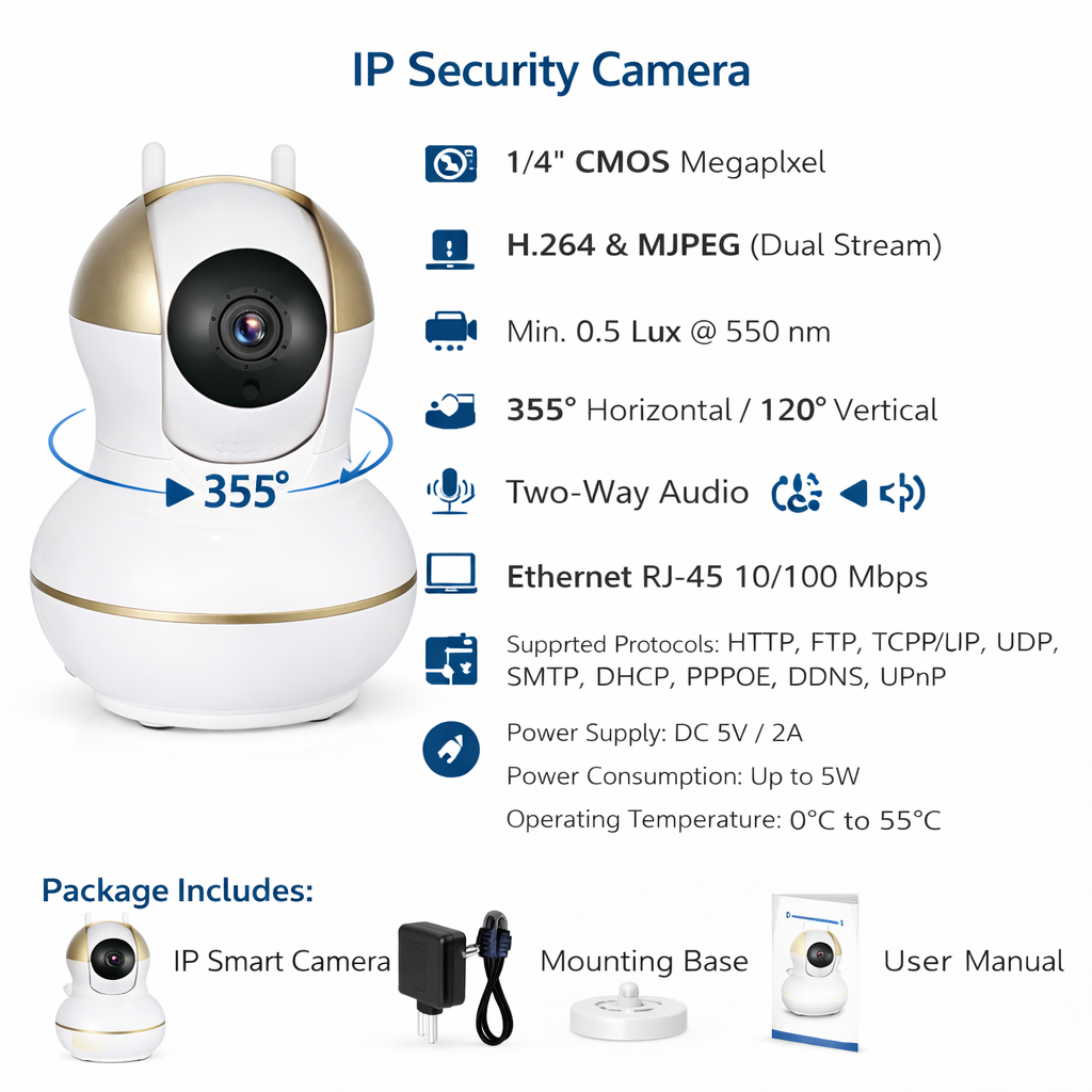 Η IP έξυπνη κάμερα ασφαλείας προσφέρει αξιόπιστη παρακολούθηση χώρου με υψηλή ανάλυση βίντεο και δυνατότητα απομακρυσμένης πρόσβασης μέσω δικτύου. Διαθέτει αισθητήρα CMOS megapixel, εξασφαλίζοντας καθαρή εικόνα και σταθερή μετάδοση βίντεο.