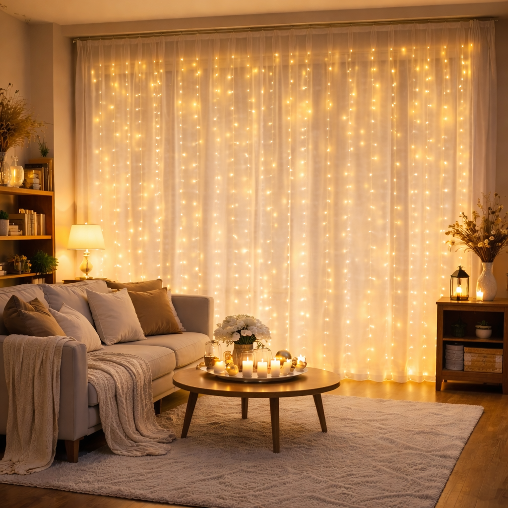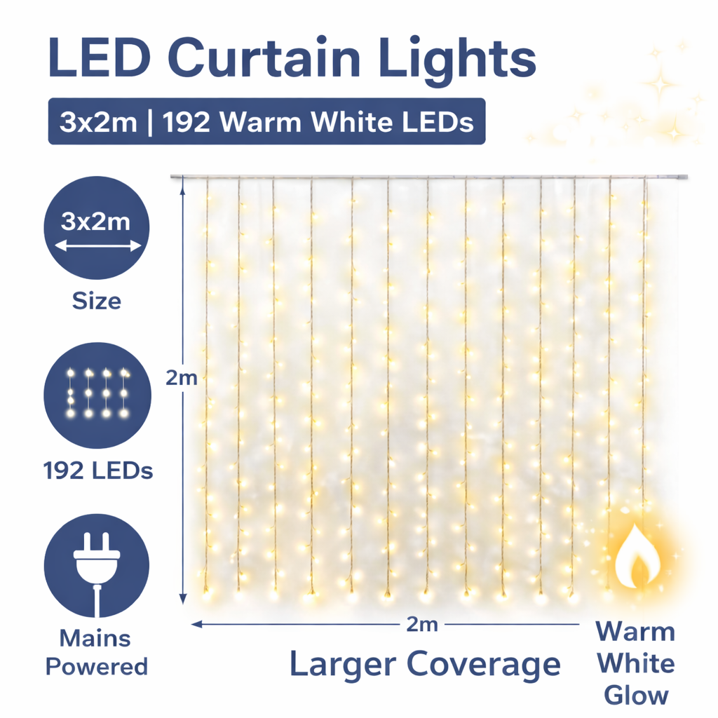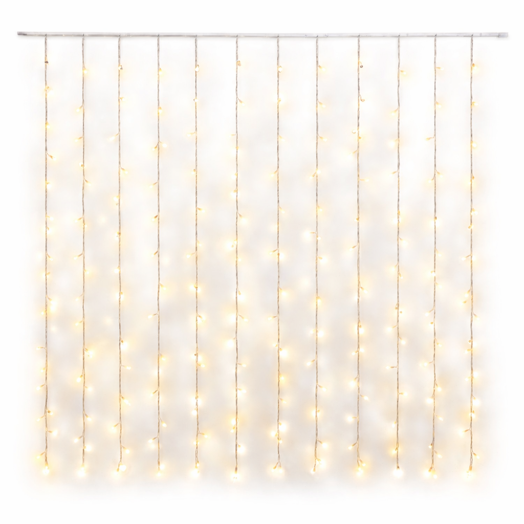 Η κουρτίνα λαμπάκια LED 3x2m με 192 φωτάκια θερμού φωτισμού δημιουργεί μια ζεστή και εντυπωσιακή ατμόσφαιρα σε κάθε εσωτερικό χώρο. Είναι ιδανική για διακόσμηση σπιτιού, εκδηλώσεων και γιορτών, προσφέροντας απαλό και ευχάριστο φωτισμό.