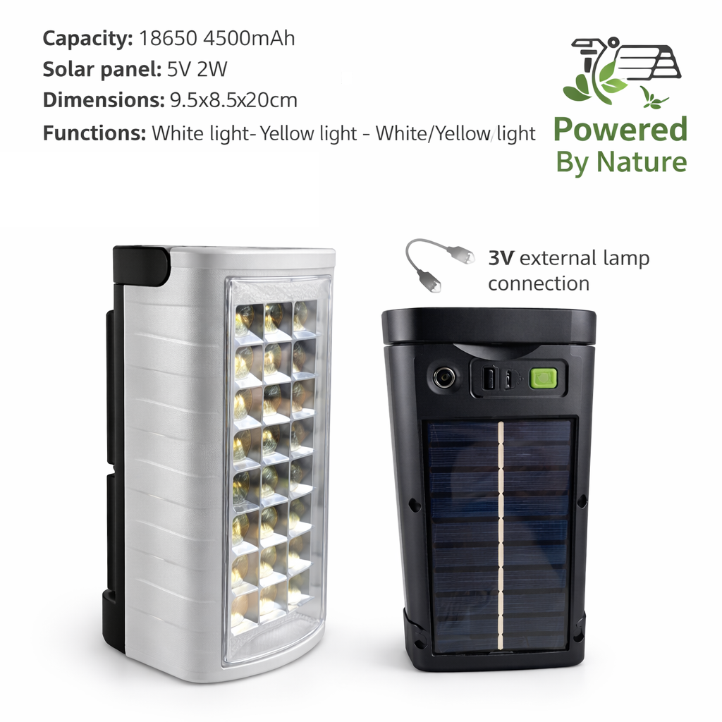 Διαθέτει ενσωματωμένη μπαταρία 18650 4500mAh, η οποία φορτίζεται μέσω ηλιακού πάνελ 5V / 2W. Υποστηρίζει πολλαπλές λειτουργίες φωτισμού (λευκό, κίτρινο και συνδυασμός), καλύπτοντας διαφορετικές ανάγκες φωτισμού.