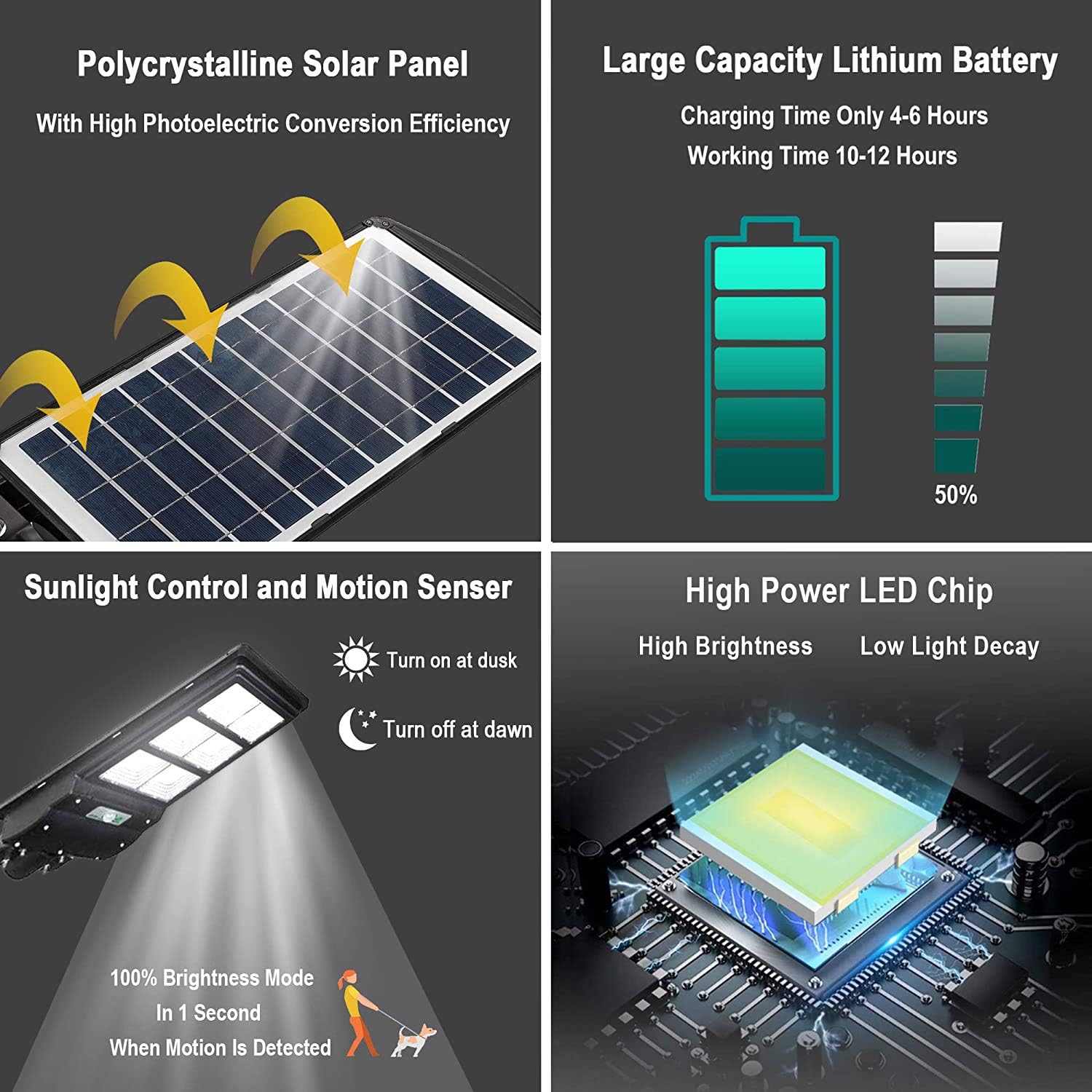 Αυτόνομος ηλιακός προβολέας αλουμινίου 300W με αισθητήρα κίνησης. Σας προσφέρει δωρεάν φωτισμό αυτόματα τη νύχτα έως και 12 ώρες. Για να φορτίσει πλήρως χρειάζεται περίπου 6-8 ώρες ηλιοφάνεια. Η κάλυψη φωτισμού είναι περίπου για 300τμ με ύψος τοποθέτησης 3-4 μέτρα.