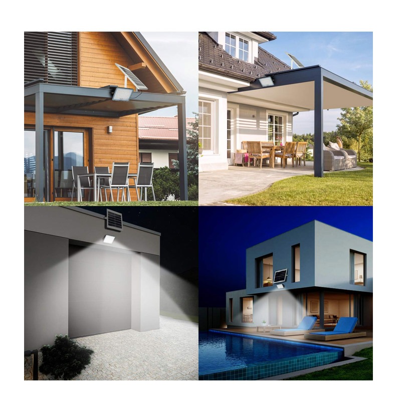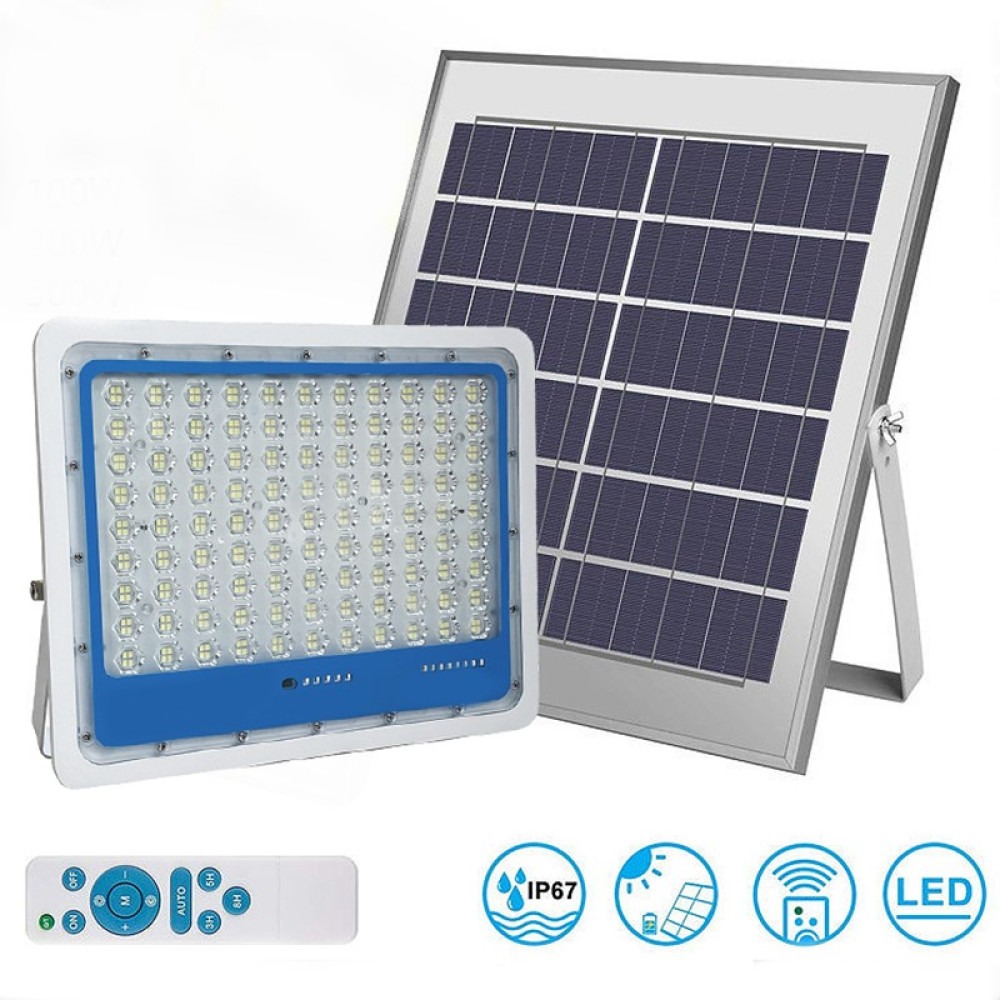 Ηλιακός προβολέας LED σε μαύρο χρώμα, με ισχύ 300W. Διαθέτει τηλεχειριστήριο για να το ελέγχετε από απόσταση. Διαθέτει βαθμό προστασίας IP67, που δηλώνει ότι έχει πλήρη προστασία από τη σκόνη και αδιάβροχη προστασία από προσωρινή βύθιση σε νερό.