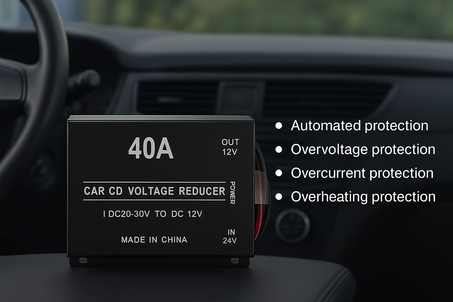 • Μετατροπή τάσης από 24V σε 12V, κατάλληλη για φορτηγά, λεωφορεία και επαγγελματικά οχήματα.