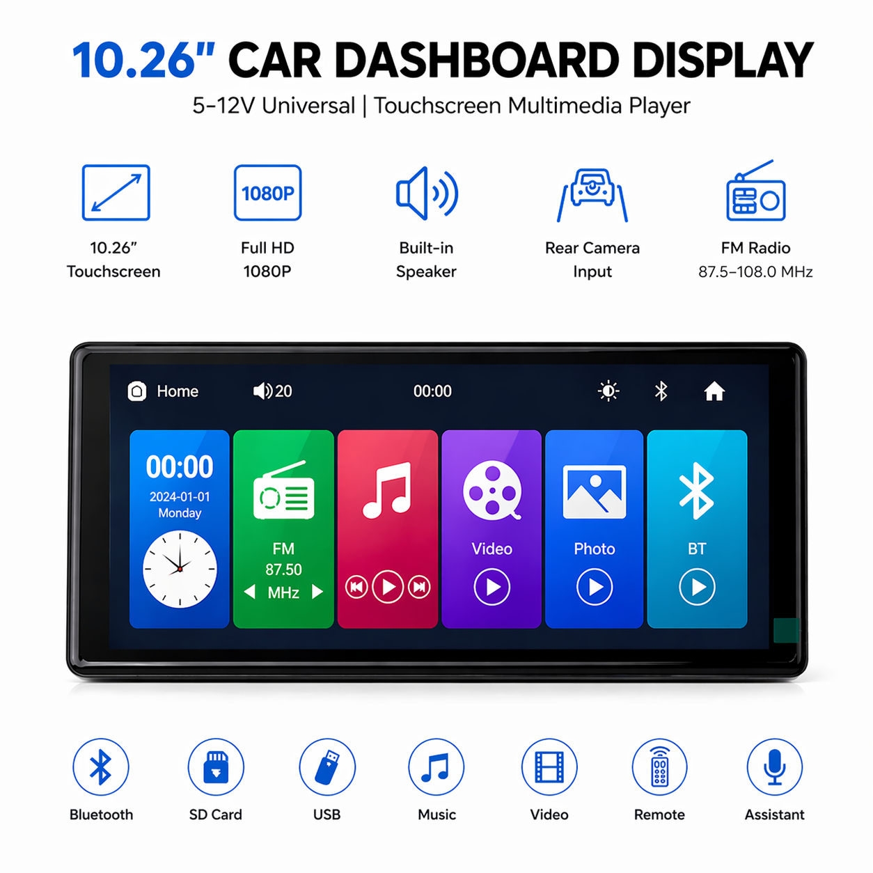 Η οθόνη ταμπλό 10.26 ιντσών αποτελεί μια ολοκληρωμένη λύση για αναπαραγωγή multimedia περιεχομένου μέσα στο αυτοκίνητο, προσφέροντας μεγαλύτερη επιφάνεια προβολής και άνετη χρήση μέσω αφής. Η υποστήριξη βίντεο έως 1080p επιτρέπει καθαρή και ευκρινή απεικόνιση, καλύπτοντας βασικές ανάγκες ψυχαγωγίας κατά τη διάρκεια της οδήγησης ή σε στάση.