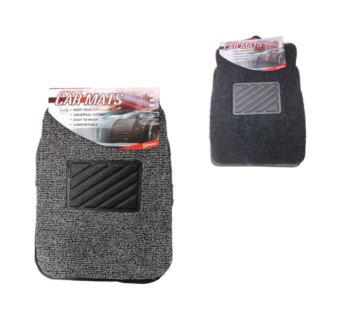 Σετ 5 τεμαχίων Πατάκια αυτοκινήτου με universal εφαρμογή: οδηγού, συνοδηγού και 3 x πίσω. Κατασκευασμένα από συνθετικό υλικό υψηλής ανθεκτικότητας, με ενίσχυση καουτσούκ και αντιολισθητική επίστρωση στη βάση. Κατάλληλα για όλους τους τύπους αυτοκινήτων. Διαθέσιμα σε μαύρο ή γκρι χρώμα.