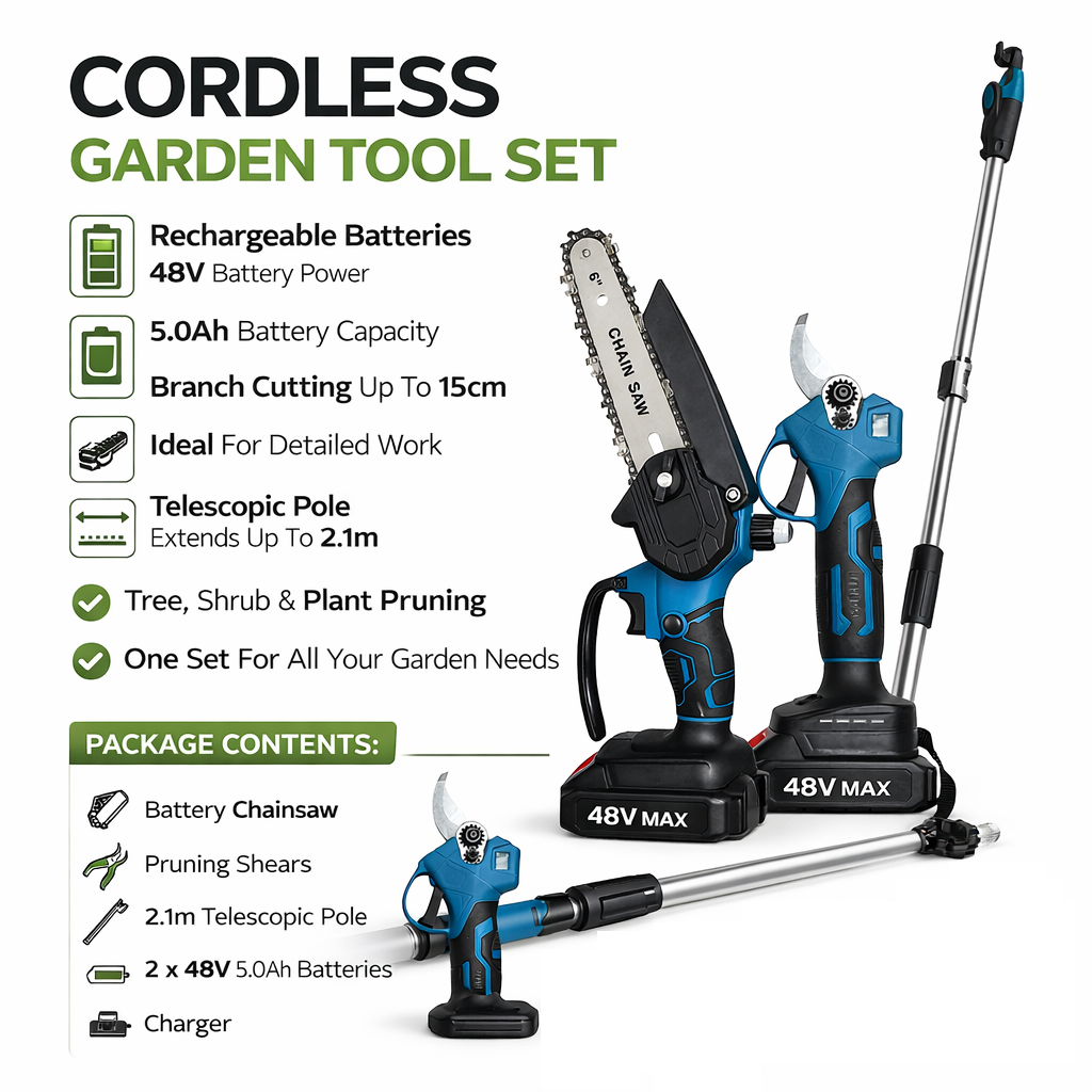 Το σετ 2 σε 1 με αλυσοπρίονο και ψαλίδι κλαδέματος 48V είναι μια ολοκληρωμένη λύση για κάθε εργασία κήπου, καλύπτοντας τόσο βαριά όσο και λεπτομερή κοπή. Με κοινές μπαταρίες και εργονομικό σχεδιασμό, μειώνει χρόνο και κόπο.