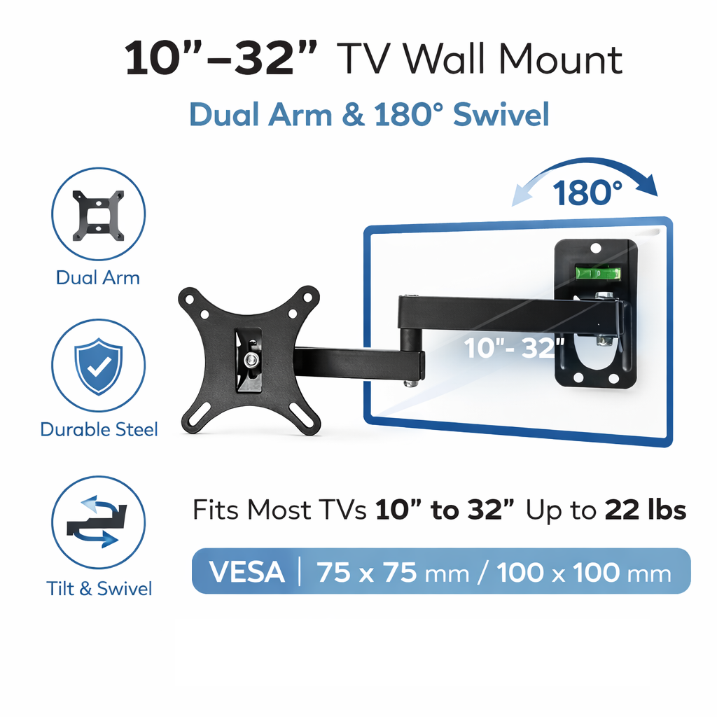 Βάση Τοίχου Τηλεόρασης 10″–32″ με Διπλό Βραχίονα & Περιστροφή 180°
