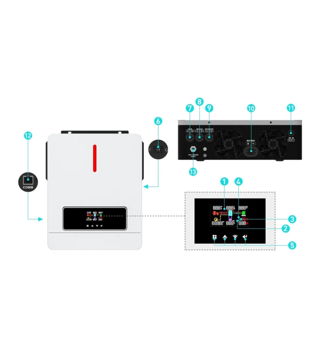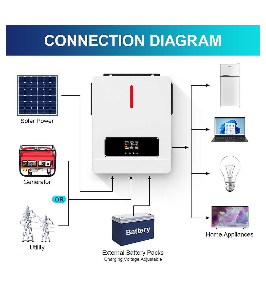 Υβριδικός ηλιακός μετατροπέας 3.6KW. Ηλιακός Φορτιστής 24V DC 120A. Είσοδος PV 500V DC. Έξοδος 2 Φορτίων. Ενσωματωμένο WiFi.